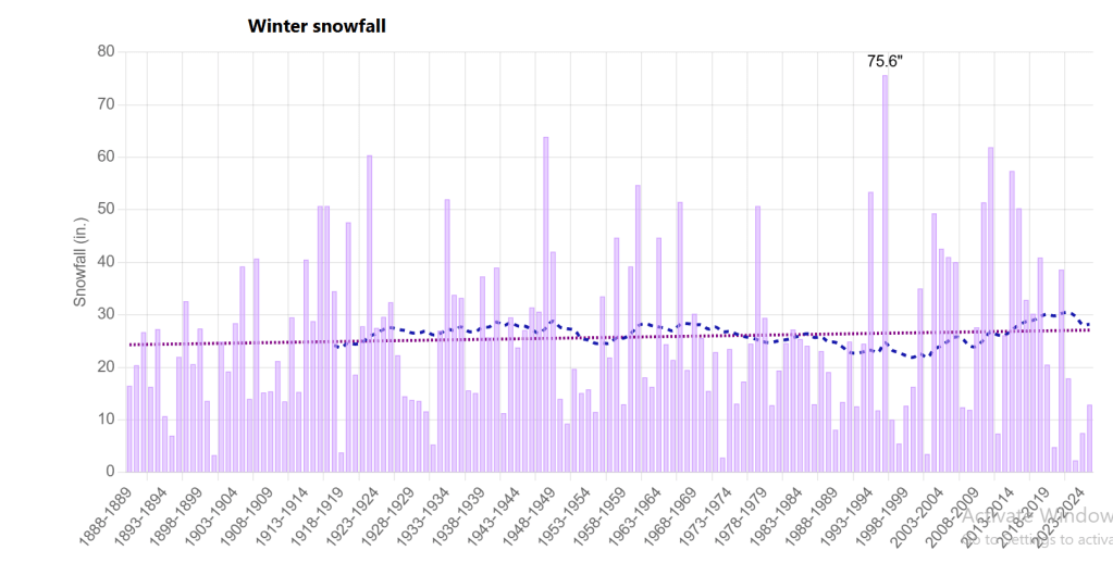 In this decade, the city averages close to 30 inches of snow per winter. Historically, winter includes multiple storms, deeper accumulation, and longer periods of snow cover. Local hazard-profiles note a trend of more “days without accumulating snow” along with declining days below freezing, highlighting changes in winter hazard patterns.