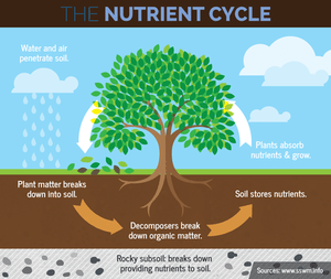 Plants absorb those nutrients. Soil carbon is released through respiration, erosion, or decomposition. Wind, rain, and human disturbance can remove soil layers.